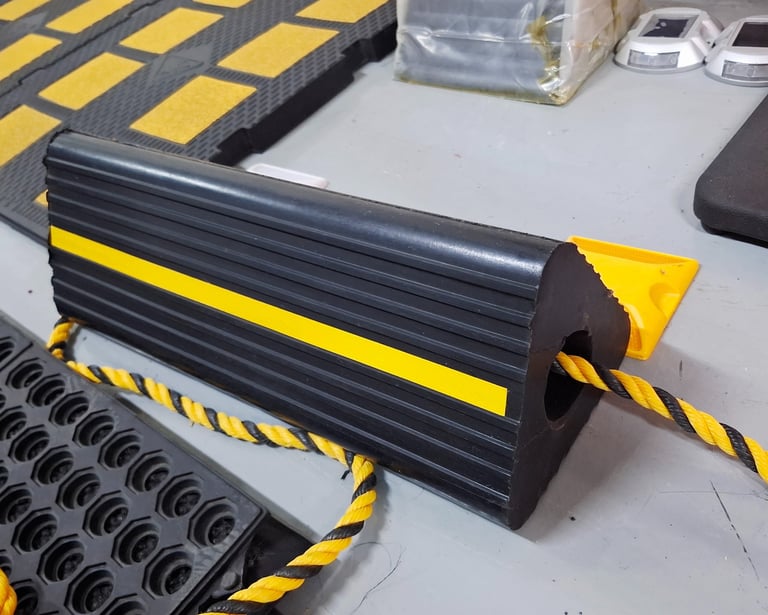 Tope de 183 cms con orificios para tornillos. fabricado de hule 100% reciclado, con cinta reflejante color amarillo.
